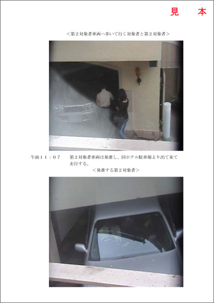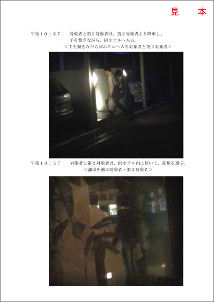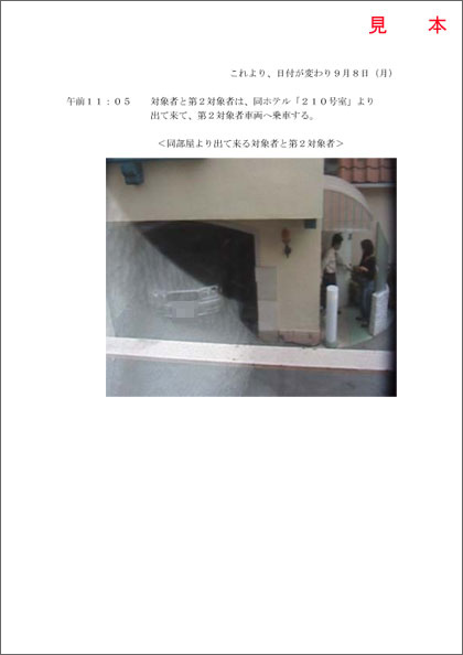 報告書例1 報告書例2 システムのご案内 完全成功報酬制度 料金完全後払い制度 他社との調査力の差別化 安心の低料金 全国経費込 調査の流れと費用 ご相談から調査完了までの流れ 調査費用について 探偵事務所の選び方 徹底比較!他社のトラブル事例 トラブル満載の他社契約書公開! 納得!当社の報告書紹介 解決!実際の証拠画像 相談事例 ご相談事例 依頼者の声 ご依頼者の声 よくあるご質問 よくあるご質問 探偵業務適正化に関する法律 離婚の法的知識 離婚の際決めること 慰謝料請求・離婚請求 離婚時の契約書・誓約書
