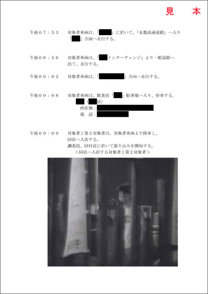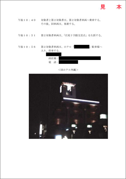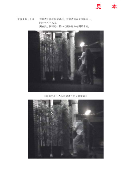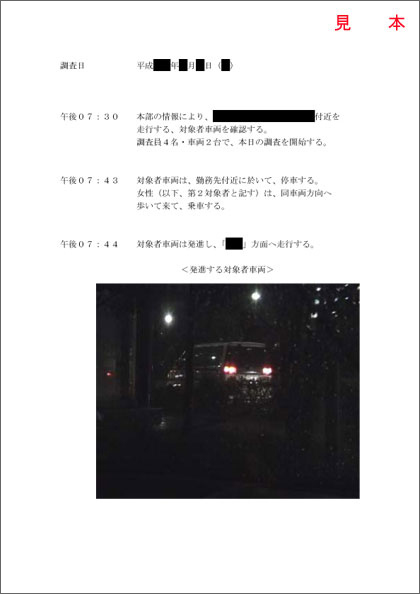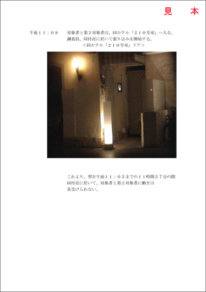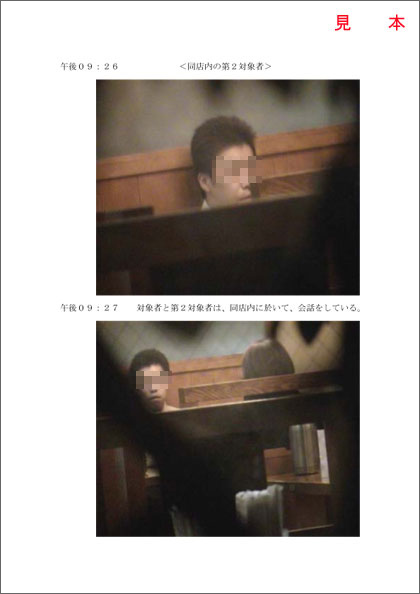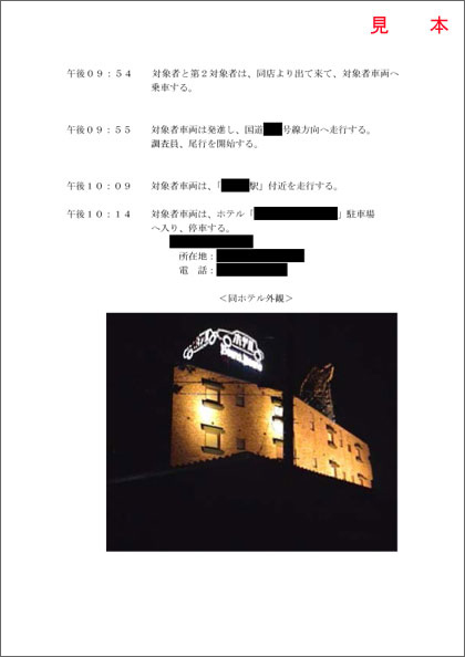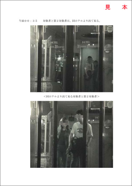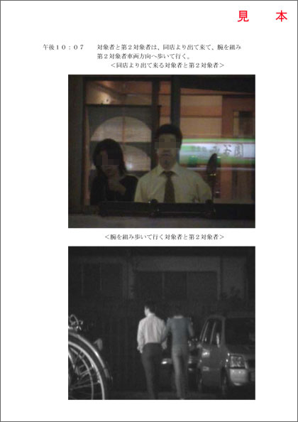 報告書例1 報告書例2 システムのご案内 完全成功報酬制度 料金完全後払い制度 他社との調査力の差別化 安心の低料金 全国経費込 調査の流れと費用 ご相談から調査完了までの流れ 調査費用について 探偵事務所の選び方 徹底比較!他社のトラブル事例 トラブル満載の他社契約書公開! 納得!当社の報告書紹介 解決!実際の証拠画像 相談事例 ご相談事例 依頼者の声 ご依頼者の声 よくあるご質問 よくあるご質問 探偵業務適正化に関する法律 離婚の法的知識 離婚の際決めること 慰謝料請求・離婚請求 離婚時の契約書・誓約書
